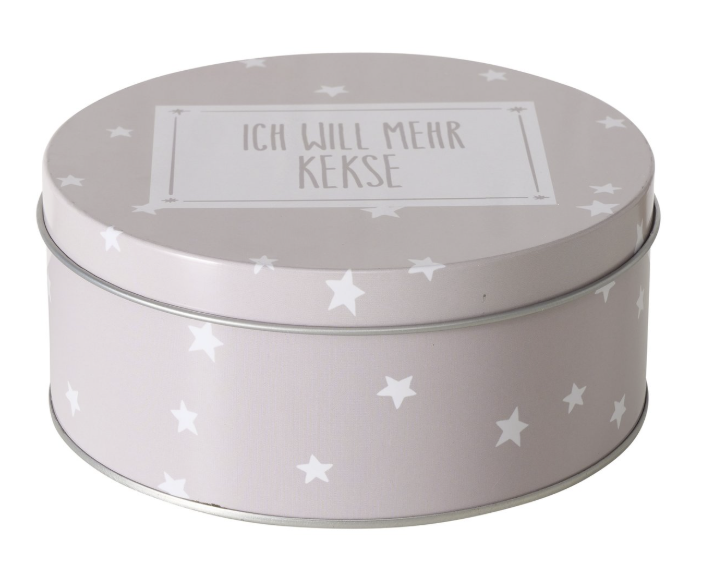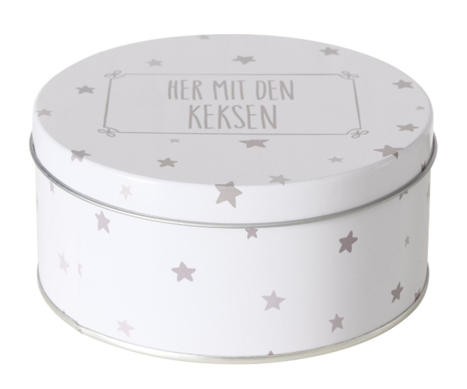 Eine schöne Metall-Keksdose mit lustigem Spruch.