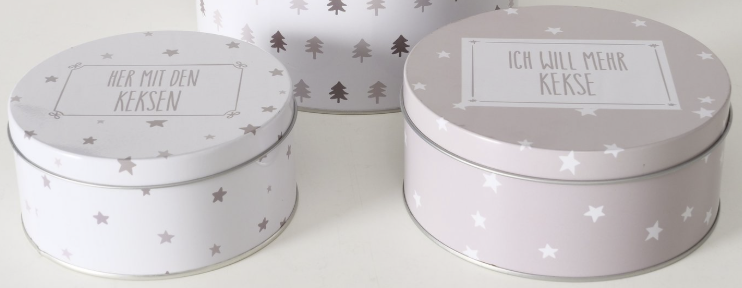 kleine Dose: ca. 13,5cm Ø - Höhe ca. 6,5cm (Her mit den Keksen - Grundfarbe weiß)