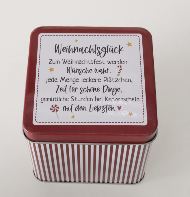 kleine rote Dose "Weihnachtsglück" : Höhe ca. 11cm - Breite / Tiefe je ca. 11cm