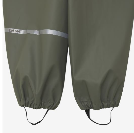 Praktisches Regenbekleidungsset aus PU von CeLaVi. Das Set besteht aus einer Jacke mit Allover-Print und einer einfarbigen Hose. Die Hose verfügt bis incl. Größe 100 über verstellbare Hosenträger mit Klickverschlüssen, danach ohne Hosenträger. Praktische, verstellbare Gummibänder an der Hose können unter den Schuhen gezogen werden. Die Jacke wird mit einem wasserdichten Reißverschluss geschlossen. Schmale Reflektorstreifen verlaufen an einem Arm und einem Bein. Das Logo ist am oberen Ärmel und auf der Rückseite der Kapuze reflektierend aufgedruckt. Die CeLaVi-Regenjacke hat eine abnehmbare Kapuze mit Druckknöpfen. Kapuzenöffnung, Ärmel und Bund sind für eine optimale Passform elastisch. Das Set ist bis zu einer Wassersäule von 10.000 mm wasserdicht. Zertifiziert nach GRS – Hergestellt aus 66 % recyceltem Material (CERES-0366).