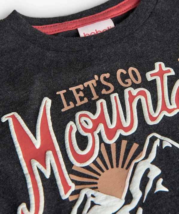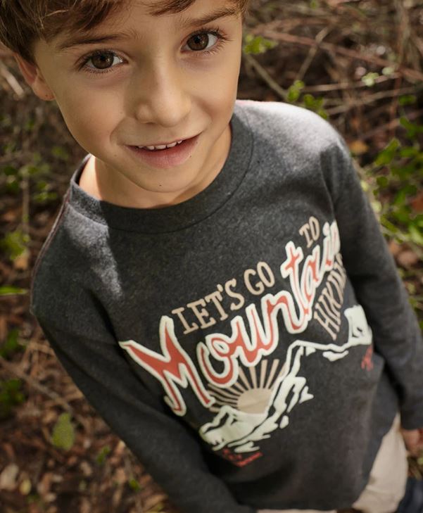 Langarm-Shirt in Grau für Jungen, perfekt für die Herbst- und Wintersaison. Aus einem weichen Stoff gefertigt, garantiert sie den ganzen Tag über Komfort. Sie zeigt ein bezauberndes Design mit Bergen und verleiht der Kinderkleidung eine spielerische Note. Der Rundhalsausschnitt erleichtert den täglichen Gebrauch und ist eine ideale Wahl, um sie an kühleren Tagen mit lässigen Hosen zu kombinieren.