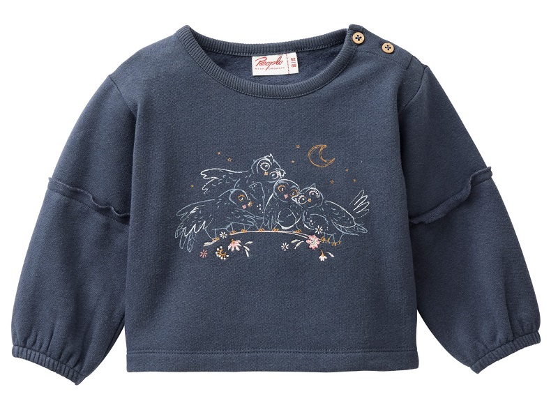 Ein Sweat-Shirt - innen leicht angerauht und sehr weich - mit zartem Eulenmotiv. Durch 2 kleine Knöpfe ist ein leichtes An- und Ausziehen über dem Kopf gewährleistet. Ideal für die Übergangs- und Winterzeit.