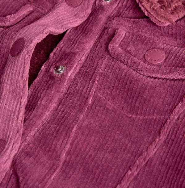 Jacke für Mädchen, gefertigt aus weichem Cord in Erdbeerfarbe, perfekt für die Herbst- und Wintersaison, sie bietet Wärme und Komfort. Sie beinhaltet ein elegantes Design mit einem Schafsfellkragen, der einen modernen Stil verleiht. Mit Knopfverschluss und praktischen Fronttaschen ausgestattet, was die tägliche Nutzung erleichtert.