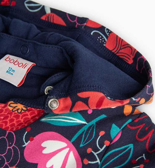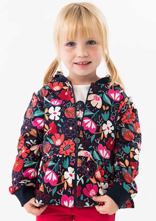 Eine bunte Sweatjacke mit Blumenmotiv. Über einen Reissverschluss kann die Jacke geöffnet werden. Sehr weiches Material und sehr angenehm zu tragen. Die Kapuze ist abnehmbar, da diese mit Druckknöpfen befetigt wurde.