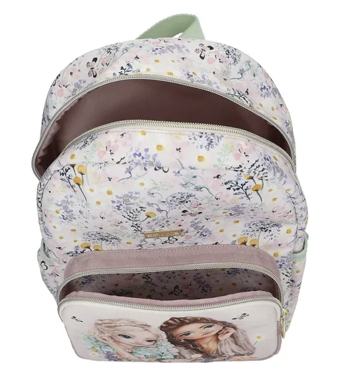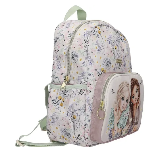 Der TOPModel-Rucksack hat auf der Front ein romantisches Doppel-Modelmotiv und rundherum ein Muster aus zarten Blumen und Schmetterlingen. In sanften Rosatönen und angesagtem Salbeigrün. Mit Hauptfach, Vordertasche und Seitentaschen. Innen mit festem Boden, der sich hochklappen lässt. Die Schultergurte sind in der Länge verstellbar.