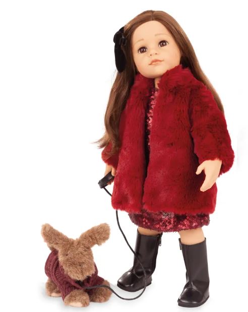 Feiern Sie das Jubiläum mit der exklusiven Puppe Hannah And Her Dog Polly - Jubilee. Sie trägt eine hochwertige Plüschjacke über einem eleganten Paillettenkleid, schwarze Stiefel und eine stilvolle Haarschleife. Ihr Hund ist in ein edles bordeauxrotes Cape gehüllt. Diese limitierte Edition überzeugt durch erstklassige Verarbeitung und ist nicht nur ein besonderes Sammlerstück, sondern auch ein Must Have für anspruchsvolle Puppenliebhaber.