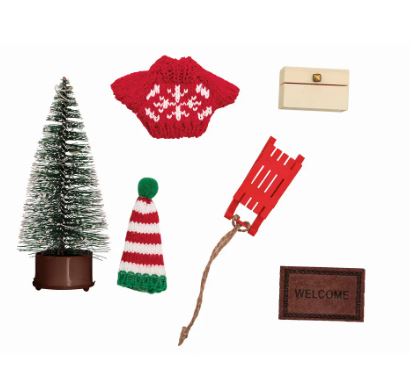 Mit diesen Mini-Accessoires erwacht die Wichtelwelt zum Leben. Dieses Set enthält alles, was Wichtel für ihre winterlichen Abenteuer brauchen: Schlitten, Fußmatte, Holzkiste, Pullover, Zipfelmütze und Tannenbaum mit Licht.